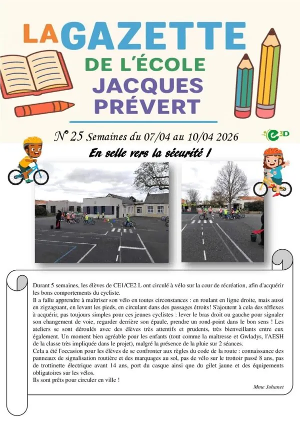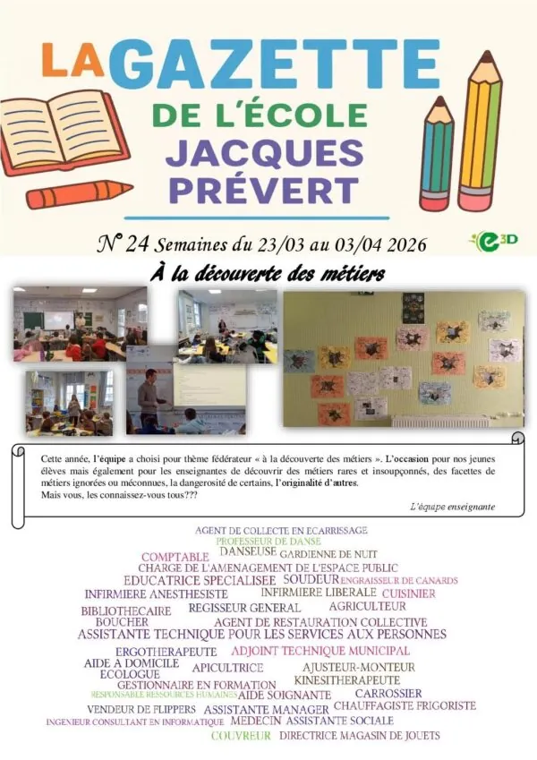 Parallèlement, les actions que nous mettons en place dans le cadre de notre labellisation E3D (École en Démarche globale de Développement Durable) se prolongeront, tout comme le travail engagé autour des thèmes civiques : les écrans, la sécurité numérique, la santé, la communication, l’égalité filles / garçons… L’école profitera tout au long de l’année d’intervenants sur ces axes, indispensables à la construction de la citoyenneté.