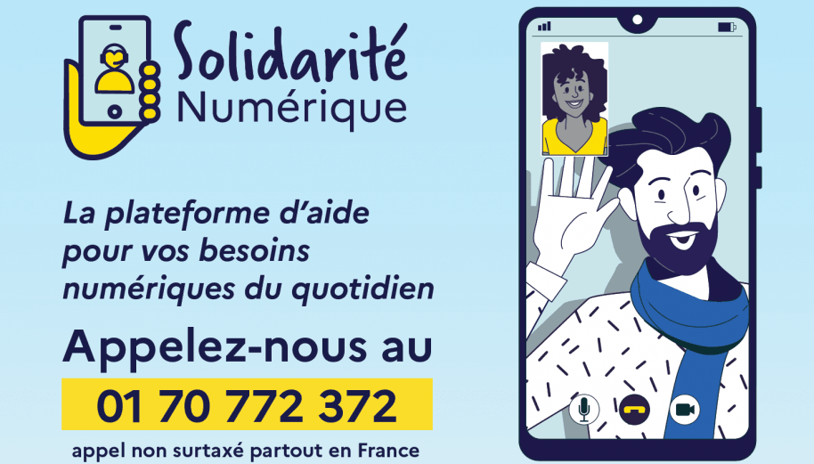 - un numéro d’appel téléphonique, 01 70 772 372 (non surtaxé partout en France), pour bénéficier d’un accompagnement à distance par des professionnels de la médiation numérique, du lundi au vendredi, de 9h à 18h.